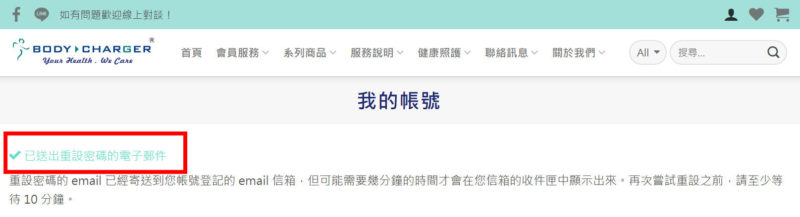 4、顯示「以送出重設密碼的電子郵件」訊息