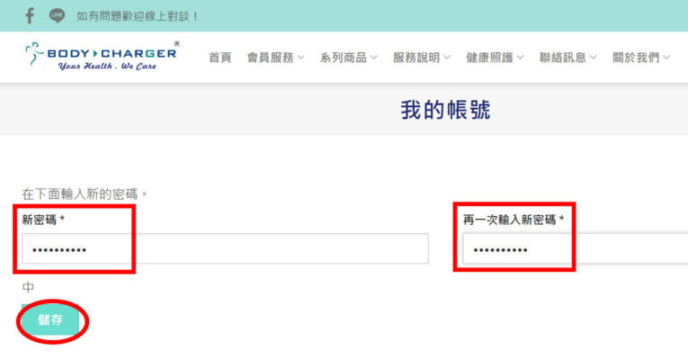 6、接著會開啟瀏覽器並出現重設新密碼的網頁,在兩個輸入欄位中輸入新密碼(密碼需相同),最後按「儲存」。就完成了程序,接下來以設定的新密碼登入網頁即可
