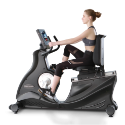 這是一台低衝擊訓練的專業坐式健身車,自由調節的座椅與腰部支撐結合,可找到最舒適的騎乘健身姿勢。低跨幅設計方便上下機台,降低絆倒危險。低阻力啟動設計最適合中高齡族群、亞健康與復健使用者。10.1吋智能儀表具有更多訓練課程、健身評量與訓練遊戲。
